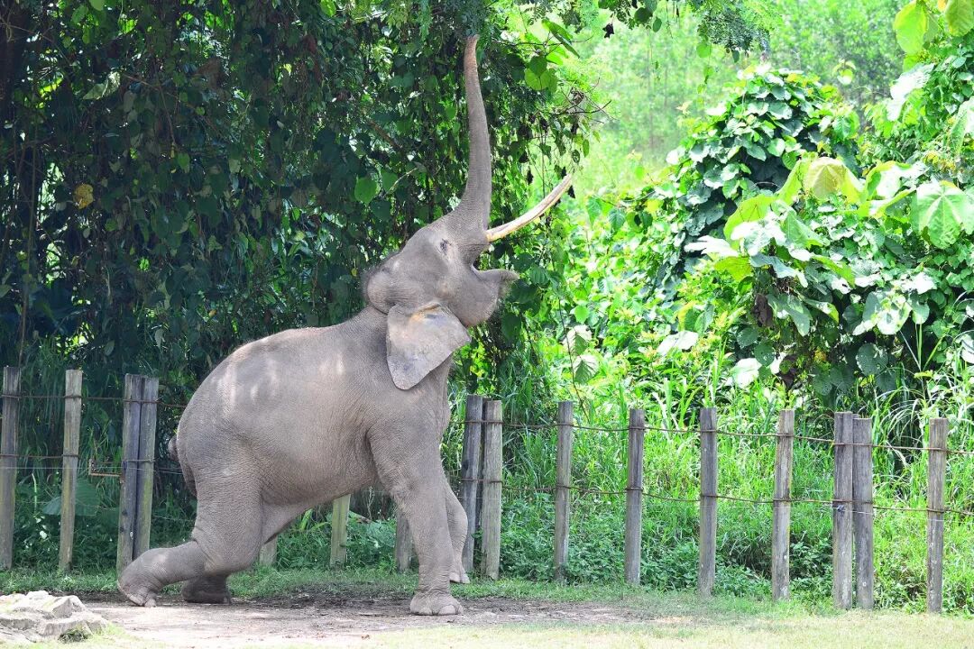 我是第一次见这种小个头的象,简直萌死了。两米多的个头,真是袖珍。最萌的地方就是上面这个:园舍的四周种了一圈的树,它们能够扯到的树叶早吃完了,因此稍高一点的怎么摆动作都扯不到。我从没有见过象摆出上面这样的动作,感觉简直要站起来了。