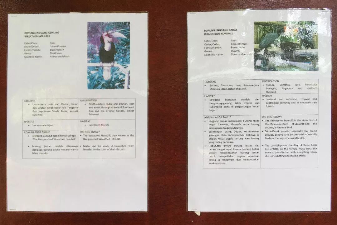 从开头的少数几个场馆就能看到洛高宜有一个好:标识牌设置得比较上心。像犀鸟这两张纸,算是整个园里最基础的介绍,有英文、马来文对照,讲得也挺详细,整个园子逛下来没看到有出错。后面有更好的简介牌,一会儿说。