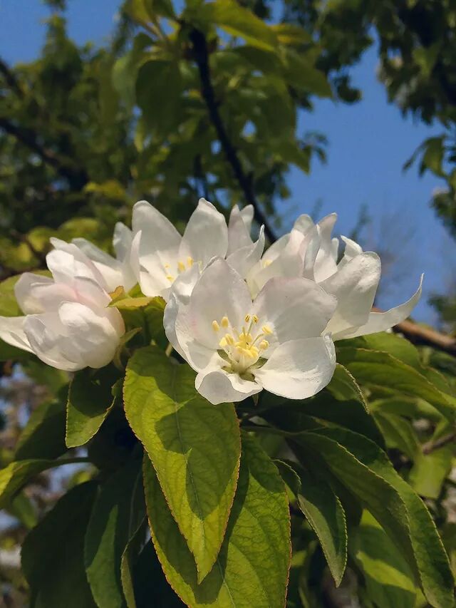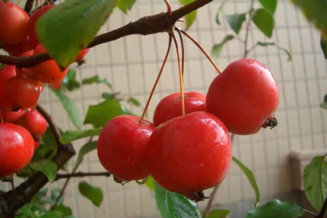 这四个种在叶子形态、花色上都极为近似,唯一较大的区别是它们的果实。苹果自不用说,它的果实妇孺皆知;而楸子和花红则比较少见,楸子的果实红且圆,常称“冬红果”,北方多做蜜饯;花红则俗称“沙果”,个头虽小,样子却像极了苹果。旧时西来的苹果还未成风,沙果就是秋天常见的水果之一,如今苹果当道,沙果只得沦落做果干了。海棠果实与其他不同,它小而色黄,即使成熟也不堪食用,于是便专事观赏,老旧的园林里常有高大的海棠树,春天赏花,秋天则赏果。