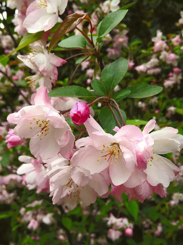 东方人喜欢海棠,欧洲人亦然,后者把我国的海棠、原产日本的多花海棠以及产自美洲的北美海棠进行更为系统的杂交育种,进而发展出种类繁多的北美海棠杂交系。杂交北美海棠的花色以及叶色极为丰富,很快成为园艺宠儿,如今国内大多数公园以及植物园的海棠园中,多数都是引进的杂交北美海棠。北美海棠的流行,让略显单调的我国海棠逐渐从园林中消失。