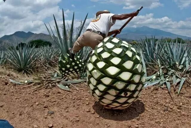 特基拉龙舌兰的采收也不容易,光看那些刺叶就知道了。负责采收的农民被称为Jimador,他们会用一种叫“coa”的特制长砍刀,砍除尖利的刺叶,直至暴露出巨大的、菠萝一般的龙舌兰芯,再从基部砍断;然后用铲车将这些大块头运送到酒厂进行酿造。采收的时机也很重要,太早或者太晚采收,都会影响龙舌兰酒的品质。