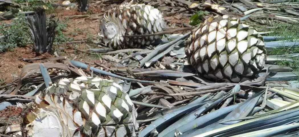 在恼人的刺叶掩护中,藏匿着一颗特基拉龙舌兰的“心脏”,当地人称之为“Piña”,这其实是它膨大成球的肉质茎;削掉多余的刺叶后,就像个巨大的菠萝,重量往往能达到200公斤以上。成熟的龙舌兰心脏,含有丰富的水分和糖类,非常适合用来酿酒。