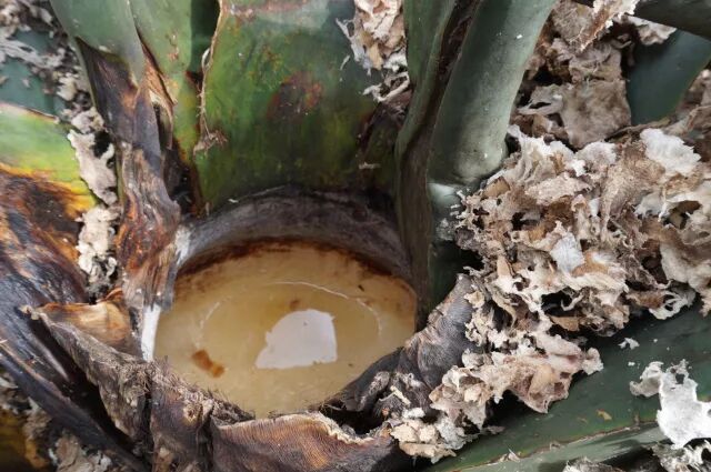 砍断花箭和多余的刺叶后,会留下一个脸盆大小的凹面,周边叶子的汁液慢慢渗入这个凹洞中。图片:Amrita Gupta / roadsandkingdoms.com