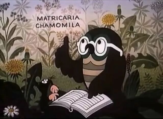 《鼹鼠的故事》之所以这么受欢迎,甚至今天成为了捷克的文化名片之一,一方面是因为小鼹鼠实在太萌,另一方面也是因为这部动画充满了人文和博物的精神,其中对于植物的描绘更是写实又精炼。为了让鼹鼠更容易为孩子、乃至让更多国家的人所接受,动画导演并没有给鼹鼠安排太多台词,而是找来了自己的女儿给鼹鼠配音,那成人模仿不了的笑声让人难忘。不过,在短片《鼹鼠与药》中还是出现了一个单词,并且成为了贯穿全片的重要线索,这就是今天日历的主角:母菊Matricaria chamomilla,它有一个更常见的名字——洋甘菊。