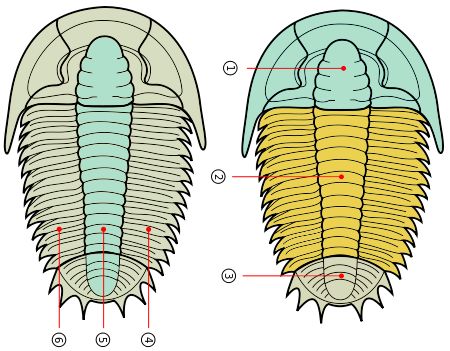 不论是三叶虫这一中文名,还是英文名trilobite,都在强调它颇具特色的身体结构:从纵轴上看,三叶虫的身体可以分为头、胸和尾板三个部分;从横轴上看,又可以分为中叶和左右侧叶三个部分。