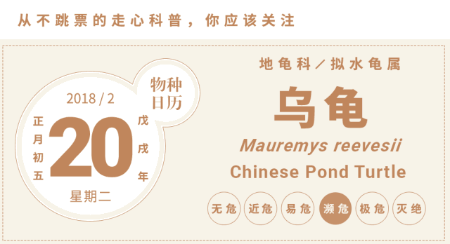 由于气候变化、栖息地丧失、过度捕杀等因素,再加上外来入侵的红耳龟(Trachemys scripta elegans)竞争有限的食物和空间资源,乌龟的野生种群数量呈逐年递减态势,世界自然保护联盟(IUCN)红色名录对其濒危等级的评估为濒危(EN)。但不幸中的万幸是,乌龟的人工养殖非常成熟,起码不用担心会有绝种的危险。