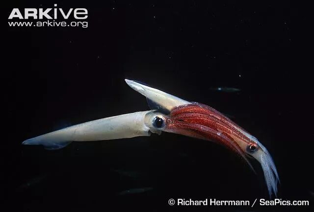 和皮氏枪乌贼同属的乳光枪乌贼夫妇正在交配,红色的是雄性。图片:Richard Herrmann / SeaPics.coma