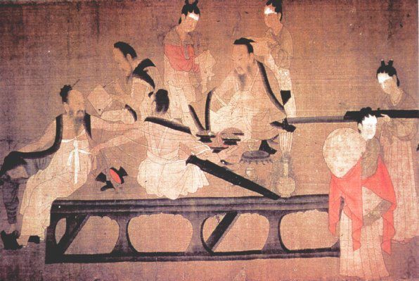 《北齐校书图》画中几位女性头上都有块白色部分,那个就是额黄,至于为什么发白……大概是……纸本身比较黄吧。图片:北齐·杨子华(宋代摹本)
