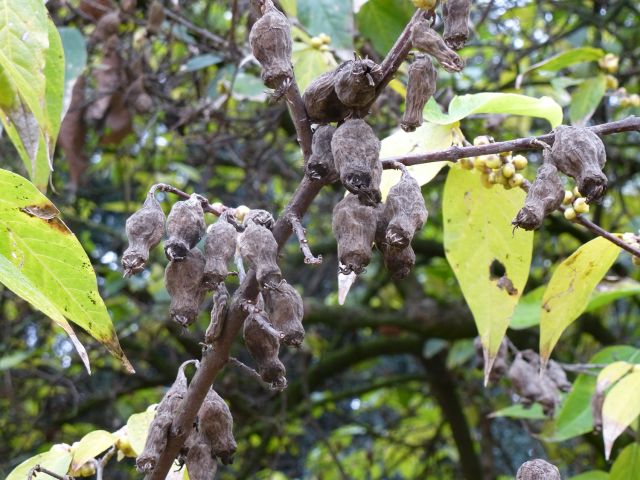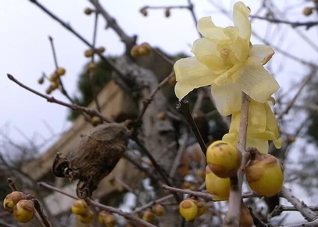 蜡梅的果托会一直赖在树上,直到干枯,变成一个虫茧似的东西。在蜡梅开花的时候,上一年的“虫茧”往往还没落下来,于是会看到一树繁花,兼之一树卵袋,尤为糟心。