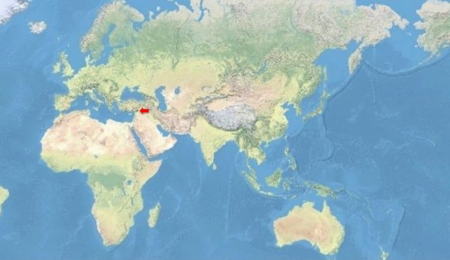 茫茫世界,叙利亚仓鼠的自然栖息地只剩下红色箭头所指的弹丸之地。图片:IUCN Red List