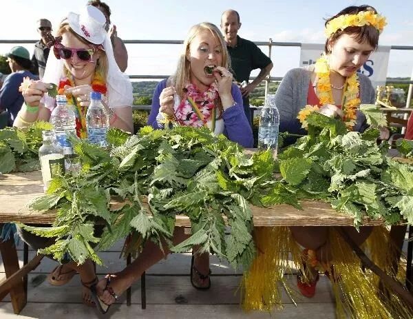 正常的荨麻吃法一般得经过蒸煮,这样可以破坏蜇人的刺毛;但是也有人把它当刺身吃,还不蘸酱油。英国有个小镇每年会举办一次生吃荨麻世界锦标赛,给每个参赛选手发一堆新鲜荨麻枝条,把叶片揪下来吃,一小时后计算每人手里荨麻光杆的总长度来评比名次,胜利者可以得到100英镑的奖金,目前的纪录保持者吃了76英尺,也就是23米。
