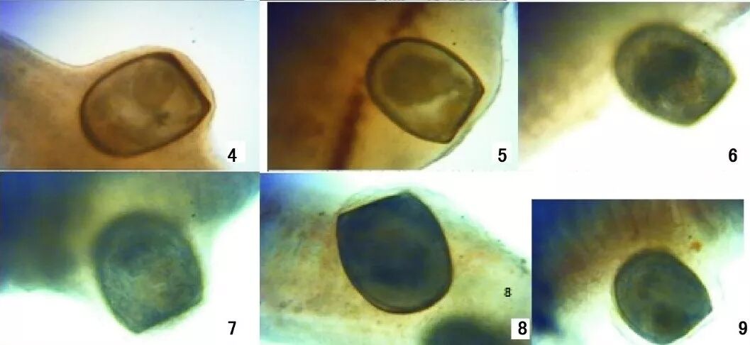 附着黄颡鱼鳃的钩介幼虫。图片:王宏, et al. /上海水产大学学报(2007)