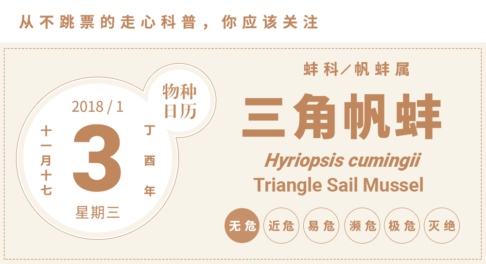 我国是目前世界上珍珠生产量最大的国家。以2014年为例,我国珍珠的年产量可占世界珍珠总产量的80%以上,这其中的95%为淡水珍珠,而在这部分淡水珍珠产量中有约80%是由单一一种蚌[bàng]育出的,它就是我们今天物种日历的主角——三角帆蚌Hyriopsis cumingii (Lea, 1852)。