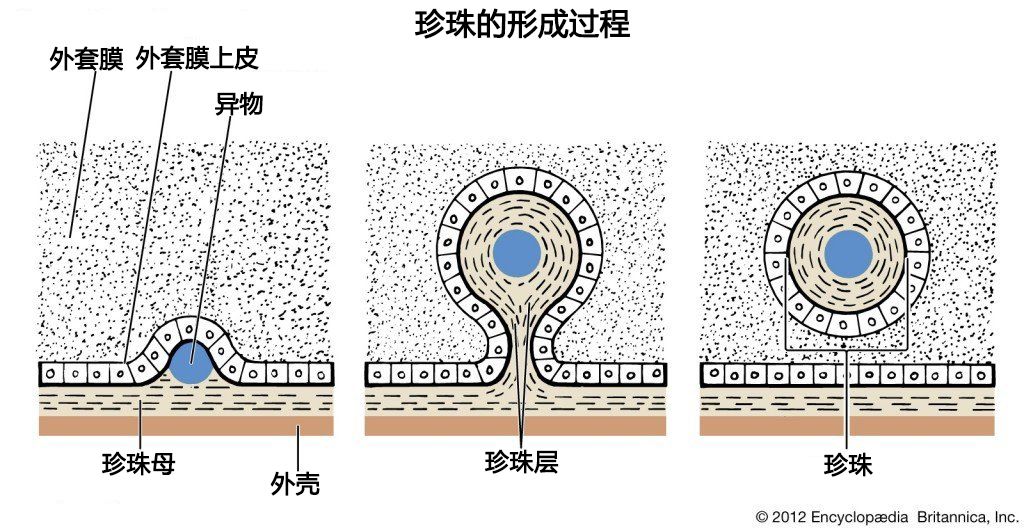 珍珠的形成过程。图片:Encyclopedia Britannica;汉化: Sundayhao