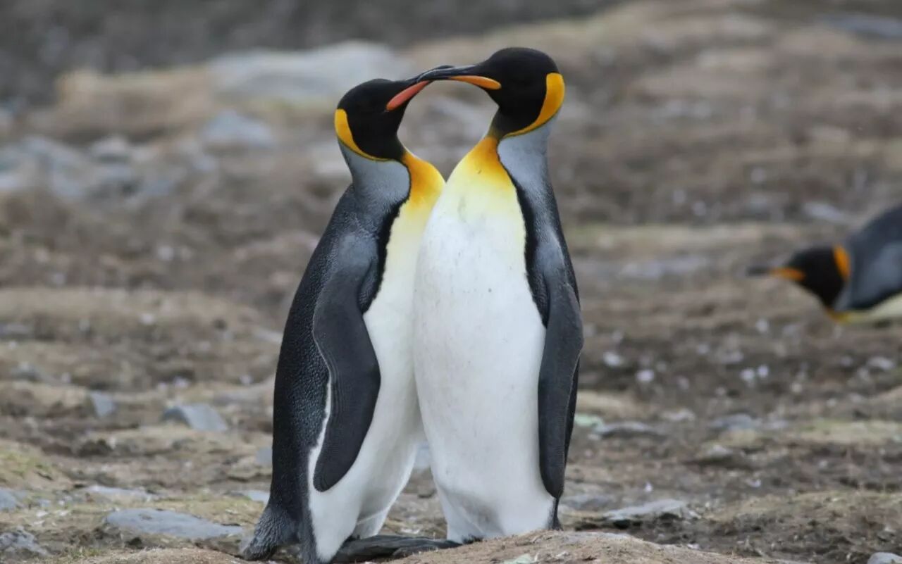 正在彼此确认亲密关系的王企鹅,通常这一系列动作包括引项高歌、对视颔首、左右交颈、然后夫妻对拜。在一个繁殖季里,一对王企鹅需要通力合作养育后代,因此维持这样的亲密很重要。图片:紫鹬