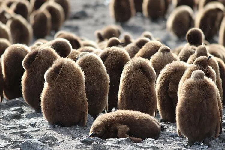 据说,早期的欧洲航海家们来到南大洋,看到上图这样的景象,产生了很自然的困惑:这两群颜色完全不同的企鹅,怕是不同物种吧?毕竟,长成完全体大小的猕猴桃们由于毛太长,看上去比换毛后更大,人们认不出这是幼鸟也情有可原。这是个企鹅界的丑小鸭的故事。