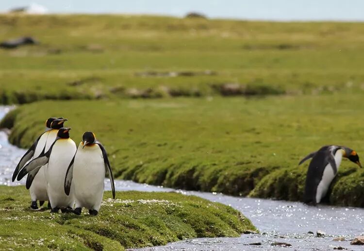 亚南极的王企鹅们生活的地方不一定是冰天雪地,也可以绿草如茵。照片中这几位刚刚完成繁殖期之前的换毛,地上还散落着一片白。图片:紫鹬