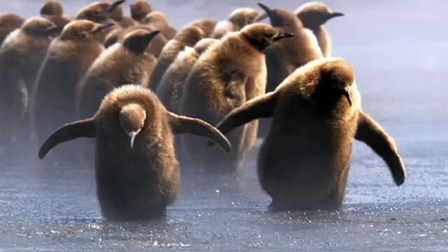 王企鹅的繁殖地四季都很热闹。因为从准备生蛋到宝宝长成要花超过一年的时间,王企鹅两口子只能两年繁殖一次或三年繁殖两次,每年开始繁殖的时间也有早有晚,因此繁殖地总是堆满了不同批次的猕猴桃。从海里回到繁殖地的王企鹅准爸妈们,会先忍受两三周不吃不喝的年度换毛,然后下海吃个饱;妈妈再次上岸后会产下一枚梨形的蛋,然后和爸爸轮流在脚背上孵蛋55天。它们不需要筑巢,自然也没有对石头的天然狂热,比起鬼畜担当阿德利企鹅优雅了许多。