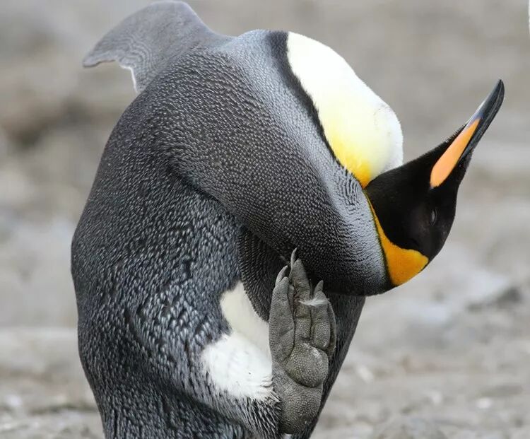 潜水前要活动开筋骨(并不是)。其实这只王企鹅正在换毛,需要抓痒。我们可以看出至少它算是灵活的胖子,潜水时自如控制身体完全没问题。图片:紫鹬