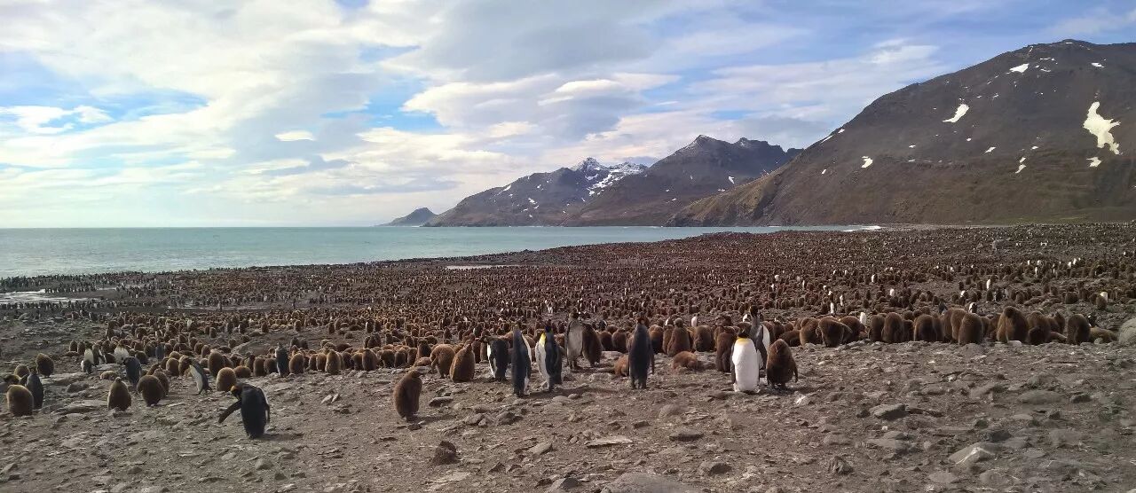 南乔治亚岛圣安德鲁斯湾(St. Andrews Bay),有今天最大的王企鹅繁殖地之一,约有15万对王企鹅在此繁殖。图片:紫鹬