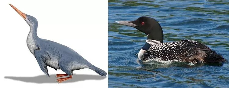 左为生活在距今6000~5800万年前的古新世的威马奴企鹅(Waimanu manneringi)复原图,人们在新西兰发现这个属的古代企鹅化石。右为现代的普通潜鸟(Gavia immer)。它们只是形态像,并不是近亲。图片:Nobu Tamura & John Picken / wiki commons