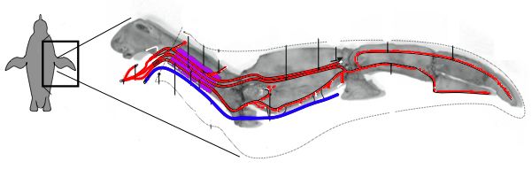 红色为动脉,蓝色为静脉,在企鹅翅根的紫色方块区域,动脉产生许多平行的细小分支,与临近的静脉进行热交换。图片: Dan Ksepka / March of the Fossil Penguins,仿Thomas & Fordyce (2008)