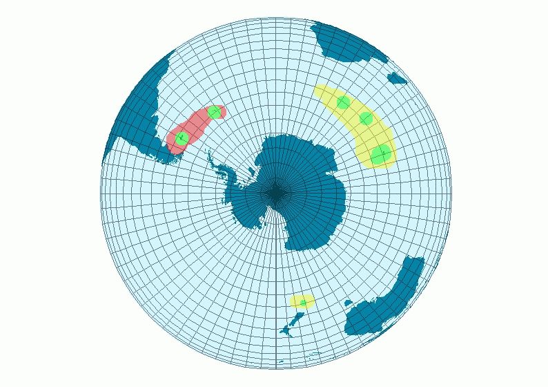 王企鹅在南极幅合带附近的岛屿繁殖(绿色区域),分化出两个亚种,红色为能出现在南美巴塔哥尼亚海岸的指名亚种(A. p. patagonicus),黄色为非洲南部以及澳洲麦夸里岛的亚种(A. p. halli)。<戳这里>复习麦夸里岛企鹅的故事。图片:Sbruchet / wiki commons