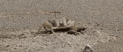 如果角眼沙蟹遇到的威胁是实实在在的,尤其是被我们或者捕食者追逐的时候,它们的横移速度会非常快,在硬质沙地的最高实验记录能达到2.2m/s,简直是螃蟹中的博尔特。整个沙蟹属的移动速度都不慢,而且在保持横移速度不变的情况下,它们还能进行180°的反向移动。抓过沙蟹的人都知道,它们的变向简直是无敌的,很快就可以把你成功甩掉、溜回洞中。