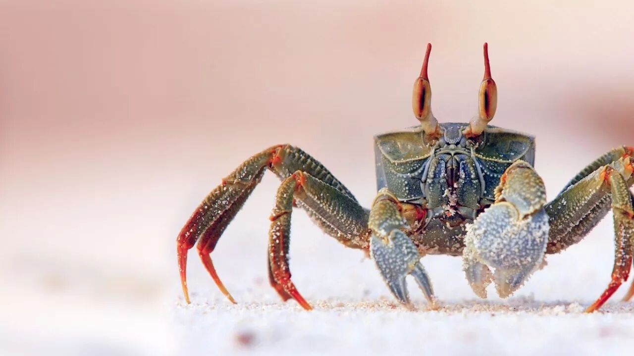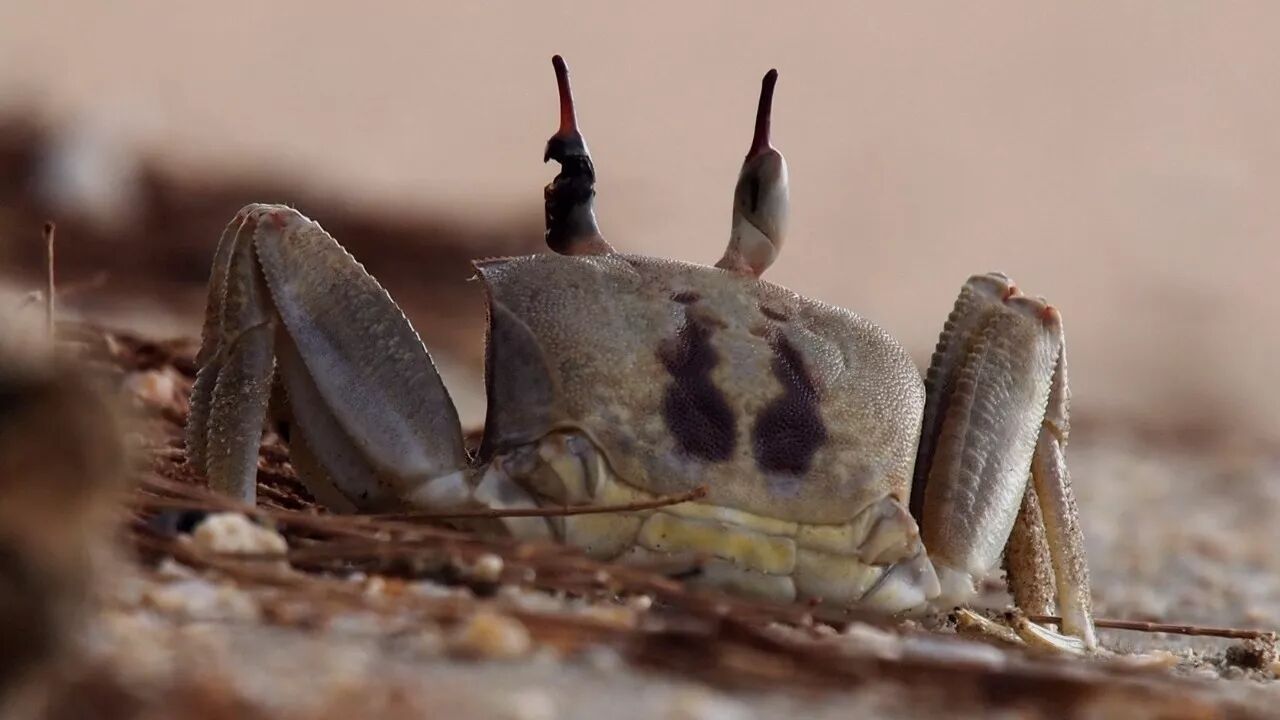 夜幕降临之后才是角眼沙蟹最活跃的时候,它们会成群出洞抢食;遇上繁殖季节,整个沙滩都快被它们占领了。因为它们大多数都有着灰白色的外壳,所以在英语中也被称为幽灵蟹。