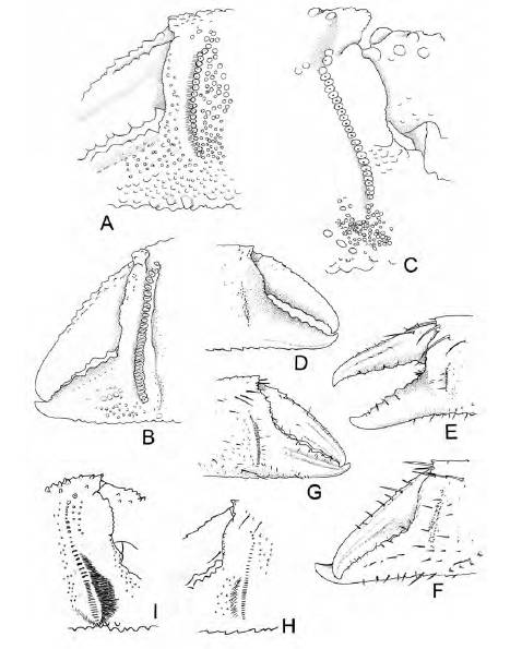 沙蟹属大螯内面的响器,其中D为角眼沙蟹的。图片:K. SAKAI et al. / Queensland Museum(2013)