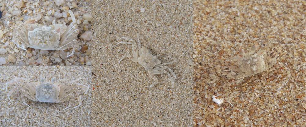 为了降低白天出洞捕食的危险系数,角眼沙蟹还学会了一招“隐身术”——生活在不同颜色沙滩的角眼沙蟹,其外壳的颜色会有所不同。沙滩颜色越浅,角眼沙蟹的颜色也会越浅;沙子颜色越暗,外壳的颜色也越深,外壳颜色的深浅由甲壳内黑色色素体(black chromatophore)的密度所控制。有实验表明,将两种颜色的沙蟹对调生活环境后,角眼沙蟹可以通过调节体内黑色素体的密度,来慢慢加深甲壳的颜色或使甲壳慢慢变浅,在一定程度上让自己更适应环境、和环境更加趋近。