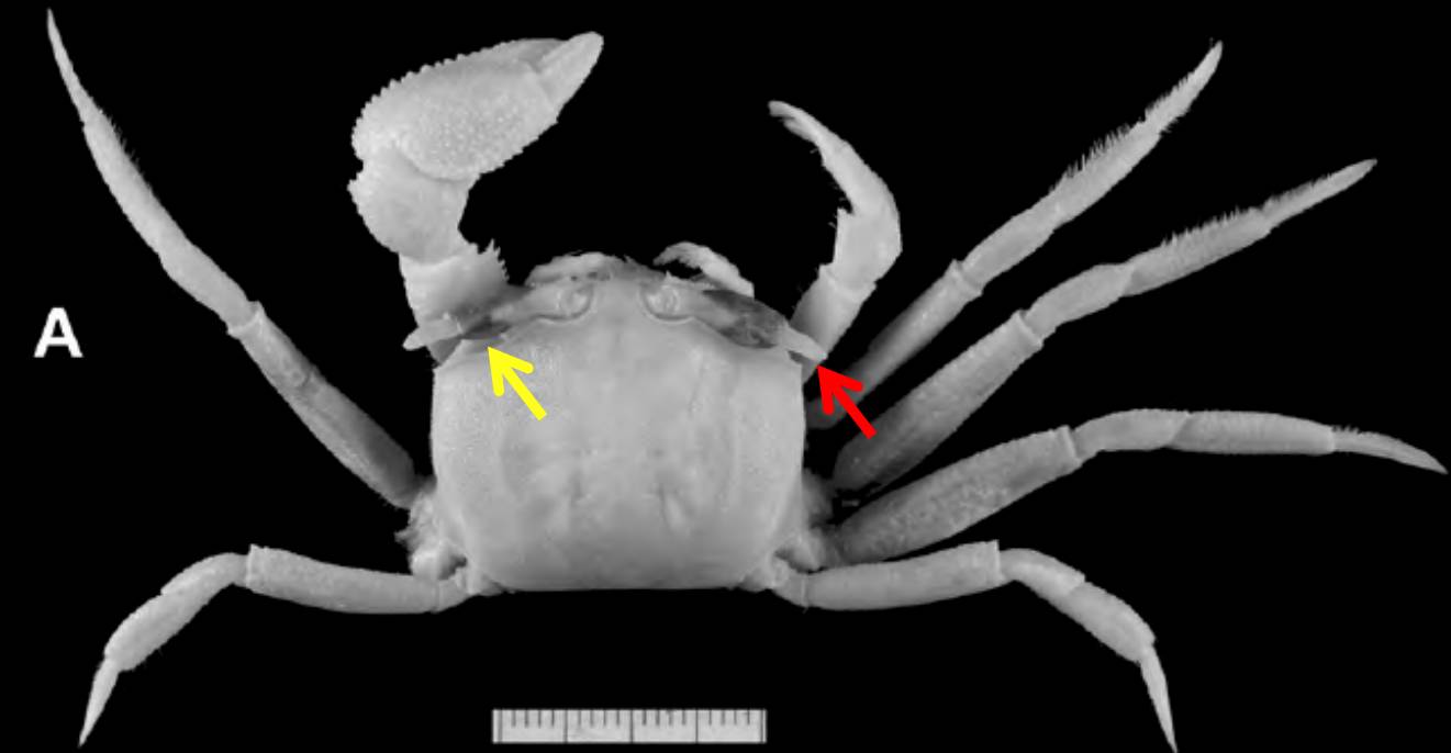 摩氏沙蟹的黑白写真,红色箭头所指的角状突起短而粗,黄色箭头所指为背眼窝缘。图片:K. SAKAI et al. / Queensland Museum(2013)