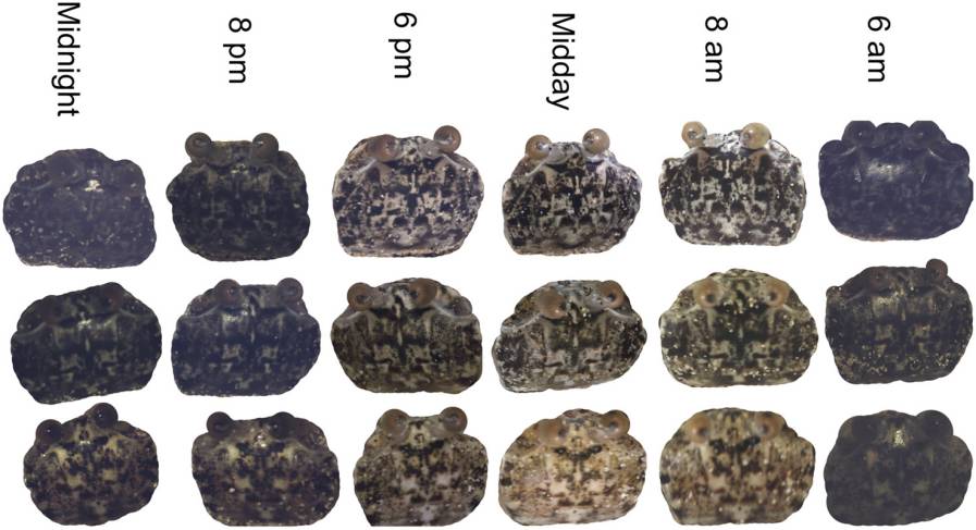 角眼沙蟹幼蟹在不同时间的颜色变化,照片在拍摄时已经进行增亮处理了。图片:M. Stevens et al. / Biological Journal of the Linnean Society(2013)
