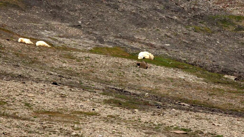 几乎在同一个地方,一只北极熊母亲和她的两个孩子,无力地趴在草坡上。 图片:紫鹬