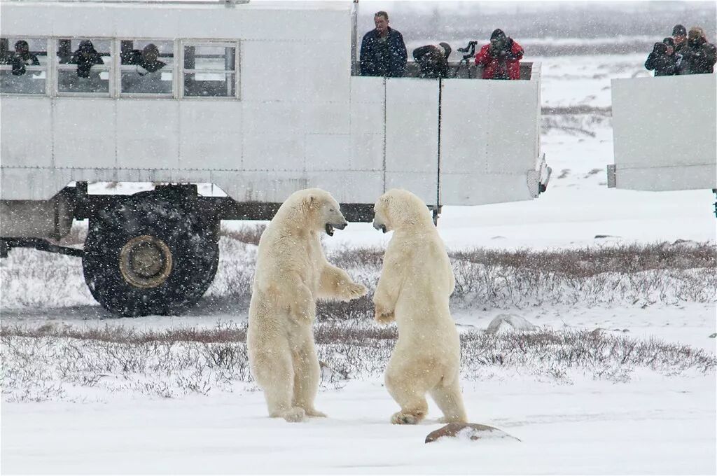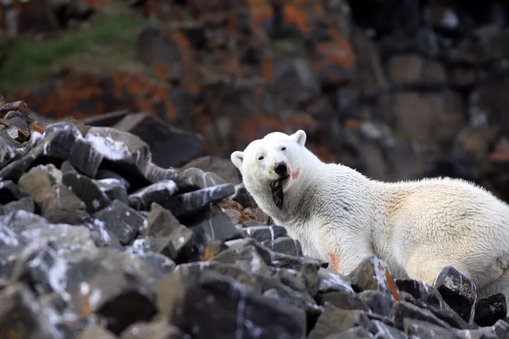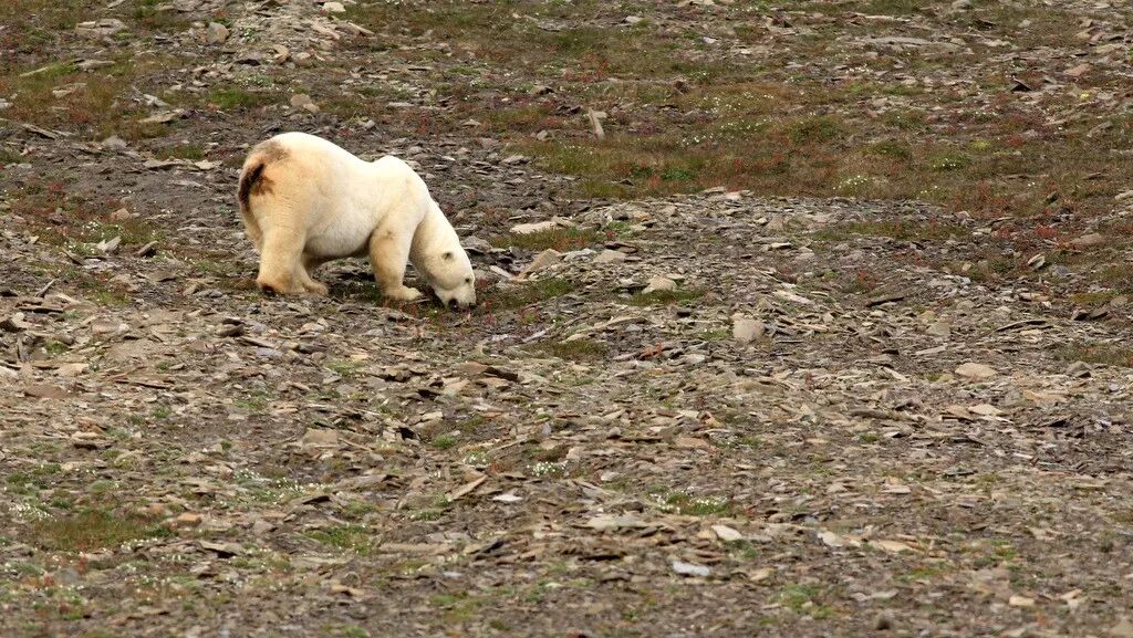 于是,每年夏末直到海冰面积最少的九月,北极熊都会面临食物青黄不接的季节。这本是自然节律,北极熊也有一定的挨饿本领,但如今饥饿却蔓延开来,粮荒的时间越来越长。北极熊甚至会铤而走险去攻击比自己更重更危险的海象(Odobenus rosmarus),还有碰运气的去捕白鲸(Delphinapterus leucas)和独角鲸(Monodon monoceros),或者如在加拿大哈德孙湾南岸的种群那样,走入人类的后院,翻垃圾桶度日,不时发生与人类接触而双方伤亡的悲剧。