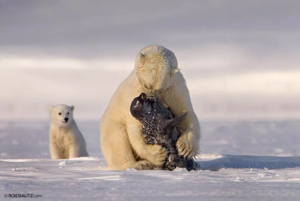 这里的海冰中有环斑海豹(Pusa hispida)的呼吸孔,这种北极地区体型最小的鳍脚类也正在初春时节养育自己幼崽,对于虚弱的北极熊母亲来说,它们是用来补充能量的重要来源。下图就是环斑海豹从海冰下呼吸孔冒出换气时,被北极熊妈妈一把扑住。在斯瓦尔巴群岛(Svalbard)海域-20℃气温里蹲守多日的摄影师,终于拍到了这难得的一幕。