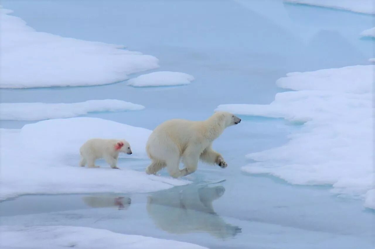冰洋海面上带着娃的北极熊妈妈。图片:AWeith / wikipedia