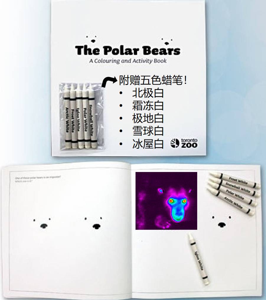 多伦多动物园曾出过一本(用来伤害小朋友们的)涂色本,真的可以随意画出北极熊的秘密花园呢……即使用了如下插页中的红外成像,野外的北极熊也是很难被人发现的。可以说,这样的描绘相当准确了。