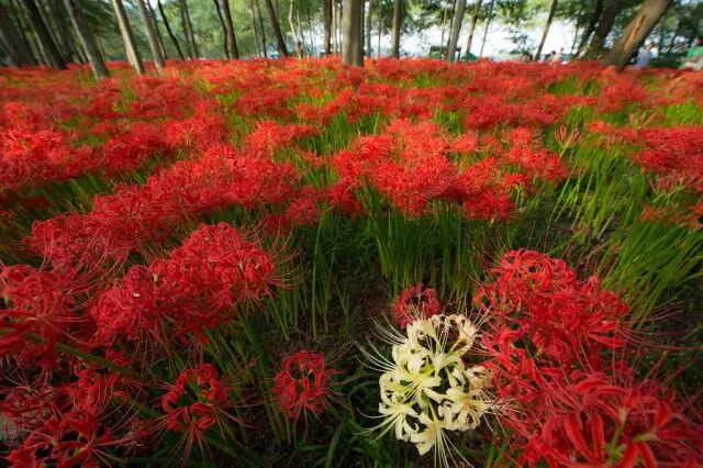 日本埼玉县日高市巾着田曼珠沙华公园里的石蒜们(是的,石蒜偶尔也有白花的)。图片:Htakashi
