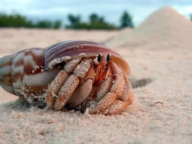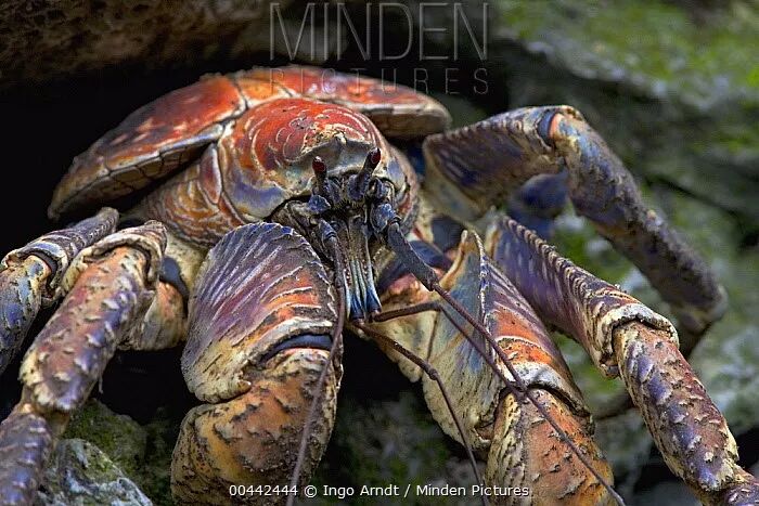 椰子蟹(Birgus latro)不是螃蟹,而是一种巨大的陆生寄居蟹。它们是现生最大的陆生无脊椎动物,体重可达4kg,肢体展开近1m。这种动物的学名种加词“latro”的意思是强盗,它们也确实是强盗,会吃任何有可能获得的食物,无论是海鸟还是椰子。但首先,还是得有如此抓到的机会。