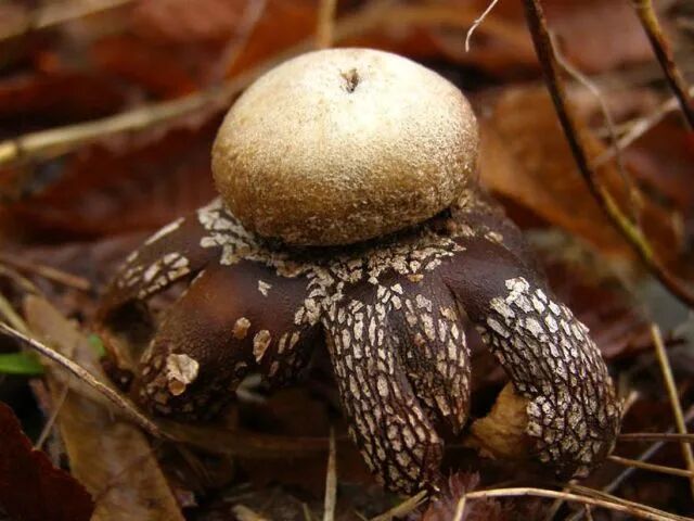 这些外包被裂片的内部本来是白色的,在展开的过程中被撕扯开来,出现一条条裂痕,就好像哥窑瓷器的开片一般,整个子实体看上去犹如一个简笔画中的星星。硬皮地星属的属名Astraeus就是希腊语中“星辰”的意思,同时也是希腊神话中的星空之神阿斯特赖俄斯的大名。