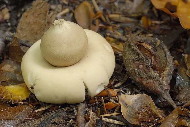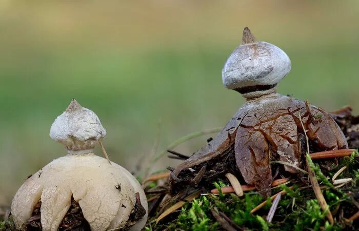 初生出来的子实体,样子像一个浅褐色的蛋,直径两厘米左右,和一枚一元硬币差不多大小。这个“蛋”的包被有内外两层,外层比较厚,像一层皮一样,成熟后会开裂成好几瓣向外展开,簇拥着中间圆滚滚的内包被。