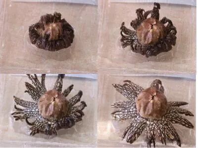 回到一开始的话题,硬皮地星的运动方式,从它的种加词hygrometricus就能看出来。这个词是由希腊语的“水(hygros)”和“测量(metron)”组合而来。当环境湿度大时,硬皮地星子实体的外包被会向外展开;而当环境变干燥后,已经展开的外包被还会卷曲回来,等到湿度升高了再伸展,就像湿度计一样能准确地对环境中的水分做出响应,这就是它种加词的来历。