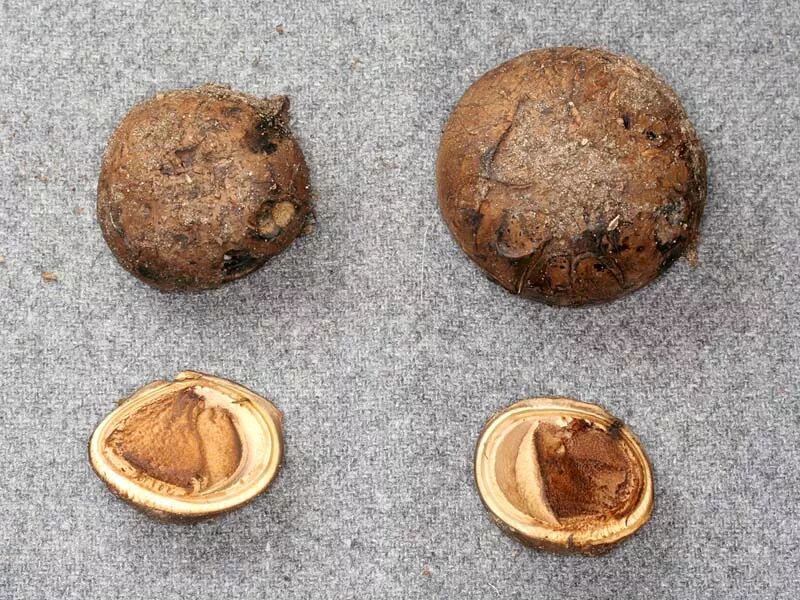 表面薄膜状的内包被,包裹着硬皮地星的产孢组织,它们的孢子就是从其中释放出来的。剥开成熟子实体中的白色球状结构,就可以看到里面棉絮般的菌丝结构和巧克力粉一样的孢子。