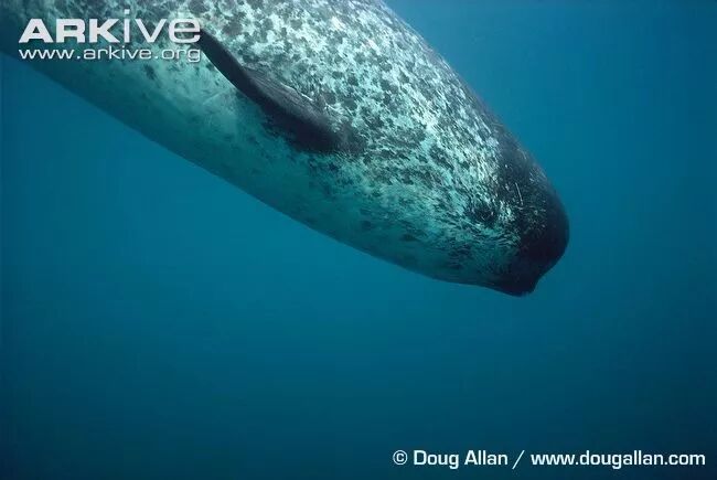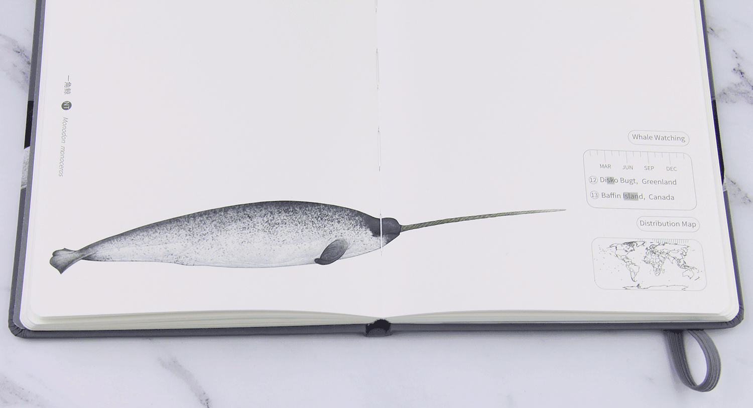 成年一角鲸为灰白色,周身散布着细密的深色斑纹,苍白而斑驳的体色,远远看去仿佛溺水漂浮的水手,因此一角鲸在英文里被称为"Narwhale"——"nār”在古诺尔斯语中有着“浮尸”的含义。