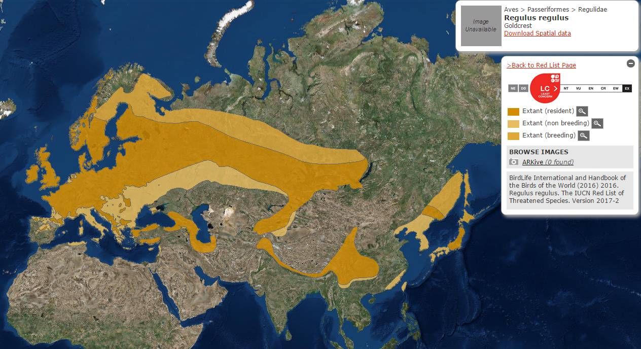 戴菊的分布,颜色最深的为居留区,最浅的为非繁殖区,最北方一条色带为繁殖区。图片:IUCN redlist