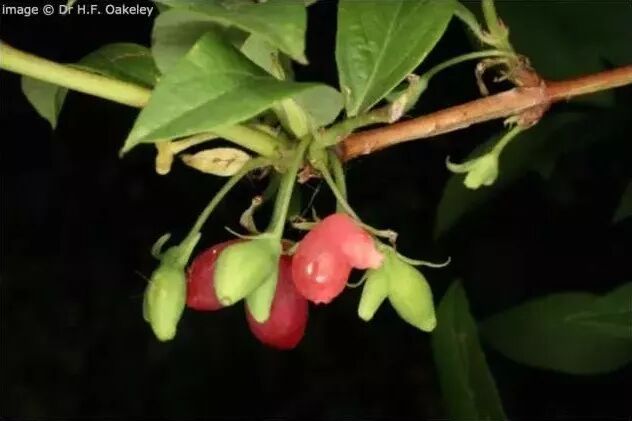 图为郁香忍冬,发育不完全的小果子呈现出一边大一边小。图片:Dr. H F Oakeley