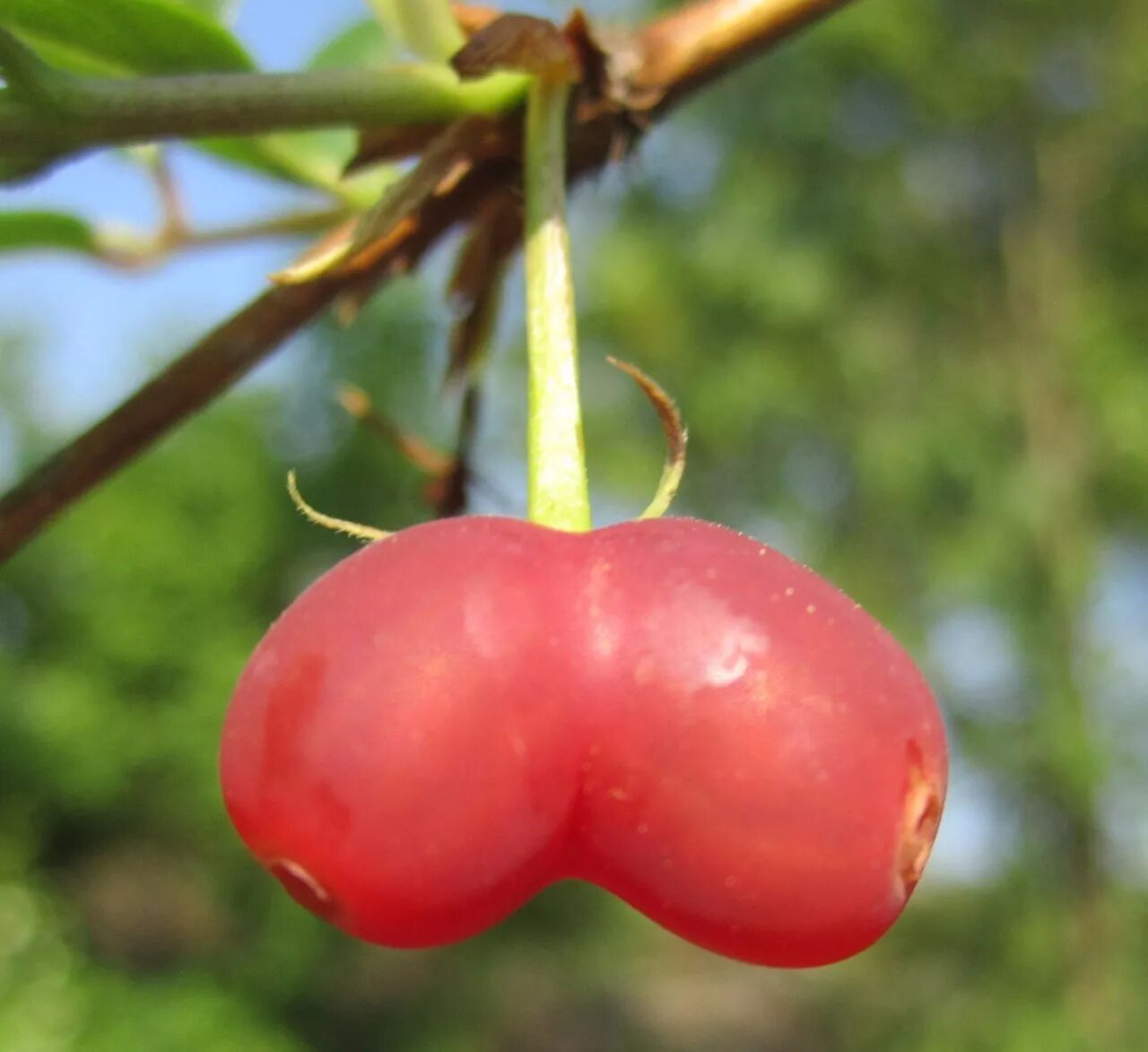 还没成熟的苦糖果是黄色的,熟透后就变成了宝石红,先不说味道,光是这鲜艳的颜色和猎奇的造型,就让它在一众野果中显得尤其醒目。有时你可能会见到苦糖果的“裤档”一大一小,这其实是果子发育不完全造成的一种普遍现象。裤裆末端各有一个缩起来的“裤腿”结构,从表面看是略微凸起的小圆圈,这是它们宿存的花萼留下的些许痕迹,在还未成熟时最为明显。
