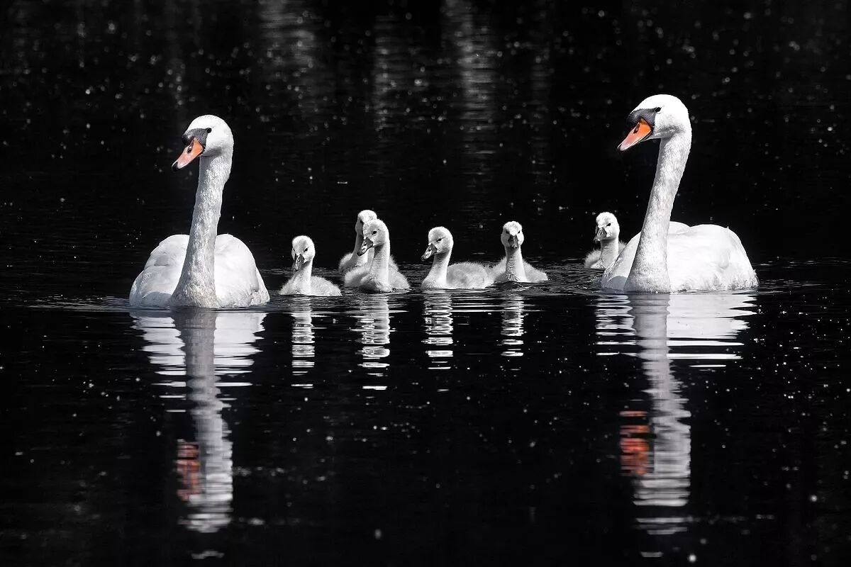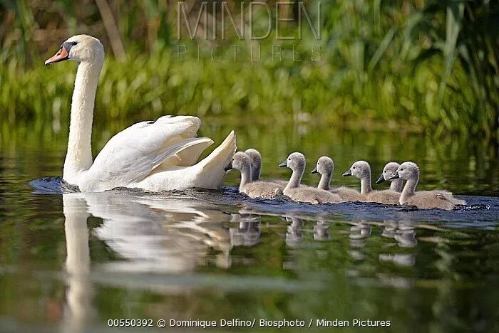 一窝天鹅蛋通常在6个左右,雌雄天鹅交替孵蛋三十多天。天鹅宝宝刚刚出生的时候是棕灰色的,躯体浑圆羽毛蓬松,虽自有一种萌点,但显然和成年天鹅的白色优雅曲线大相径庭,《丑小鸭》的故事也因此而生——不过和故事里不同的是,它要到2岁的时候才能变成纯白色。很小的天鹅会骑在妈妈背上,防止被水下的大鱼攻击,稍大一点就会排成一列跟在妈妈背后游泳。