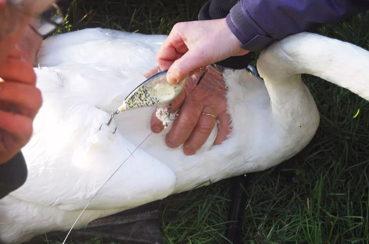 最大的问题,其实在于垂钓使用的铅垂。天鹅会把铅锤当成胃石吃掉,而被其他胃石碾碎的铅会很快进入血液,由此引发铅中毒、带来食道括约肌痉挛。这样的天鹅,多半会因为食物不能进入胃中而活活饿死。所幸英国已经通过了禁止使用铅制渔具的法案,天鹅的处境如今已经大为好转。